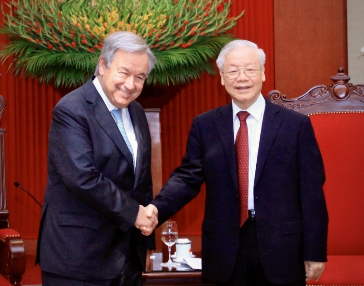 Kơsơ̆ năr 21/10, tơ̆ Anih jang Trung ương Đảng, ƀok Tổng ƀĭ thư Nguyễn Phú Trọng hlôi xơng ƀok Tổng thư kĭ Liên hơp kuôk Antonio Guterez.