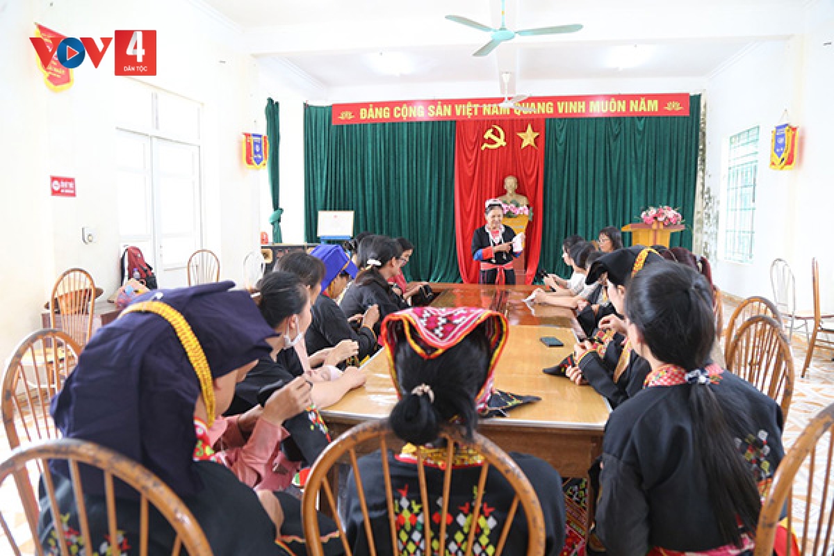 Mới 7h30 sáng, các bà các chị qua từng nhà rủ nhau đi đến lớp học đặc biệt được mở ở Nhà văn hóa thôn Đồng Bé xã Sơn Dương. Bà Trương Thị Đông (61 tuổi, nhà ở xã Bằng Cả cách lớp học gần 20km) được chồng đưa bằng xe máy theo con đường dốc quanh co đến hướng dẫn cho các học viên thêu thổ cẩm.