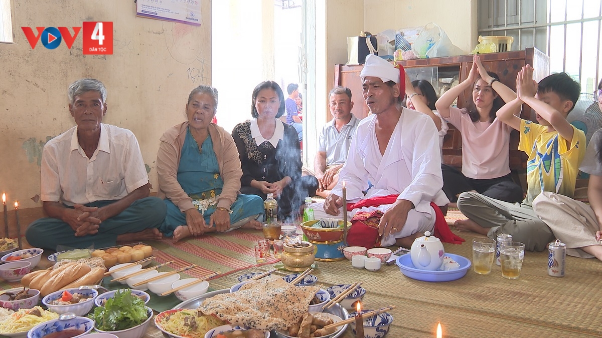 “10 mâm là bánh, 10 mâm là đồ mặn gồm: canh, cá nướng, cá kho, phải có canh gà, rồi cơm đó là cơ bản. Bây giờ theo thời gian người Chăm phát triển về kinh tế, thì người ta có thể trưng bày thêm nữa, nhưng mà cơ bản vẫn là phải có các món đó. Có nhà sẽ có thêm những món như: cà ri hay là món vịt dầm…, tùy theo kinh tế của mỗi nhà”.