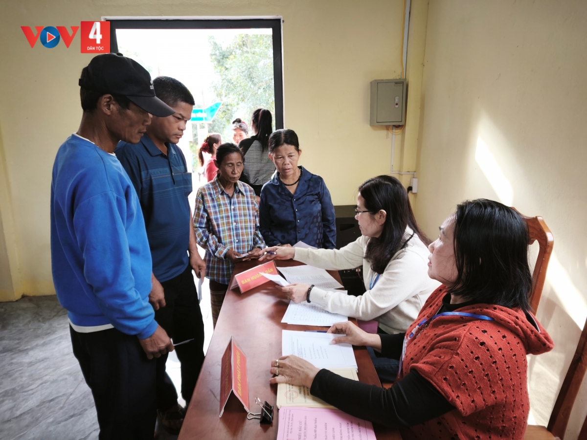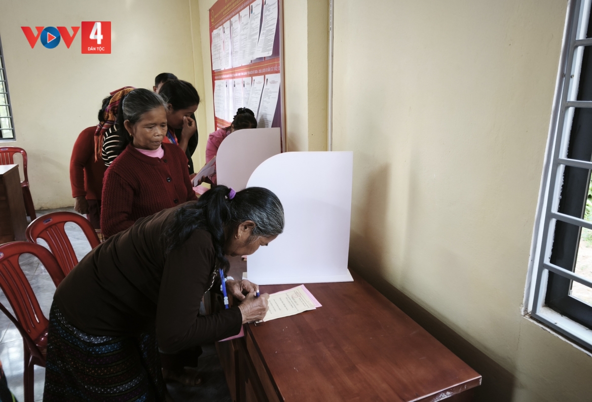 Đhị zr’lụ t’moọt phiếu dông cờ k’tiếc k’ruung, cha nụp Chủ tịch Hồ Chí Minh đhị trung tâm; ra pặ bàn Tổ bầu cử, bàn đoọng phiếu, bàn xrặ phiếu liêm choom; hòm phiếu đơc đhị buôn lêy, tệêm ngăn; vêy đhị xrặ phiếu lưn lơớp, tệêm ngăn t’la phiếu bơơn lơớp, vêy nội quy phòng t’mọot phiếu, sơ đồ pa choom đhanuôr; vêy zr’lụ lalay đoọng ha ma nưih khuych goo, manưih t’cooh t’ha./.