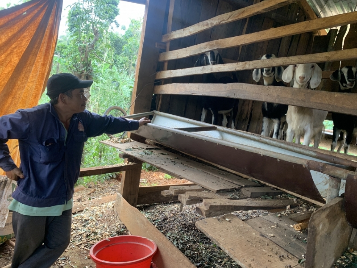 Dẫn chúng tôi thăm dãy chuồng dê hơn 20 con, ông Quách Thiện, ở thôn Đắk Rmo, xã Đắk Ndrung, huyện Đắk Song, phấn khởi cho biết, nuôi dê đã giúp gia đình ông có thêm nguồn thu đáng kể. Gia đình ông Thiện chuyển đến huyện Đắk Song từ năm 2006 nhưng đông con và thiếu đất sản xuất nên mãi vẫn thuộc diện hộ nghèo. Đầu năm 2020, các đảng viên trong thôn Đắk Rmo và xã Đắk Ndrung hỗ trợ gia đình ông 4 con dê giống, làm chuồng và hướng dẫn cách chăn nuôi, phòng bệnh. Đàn dê sinh sôi nhanh, ngay trong năm đầu tiên đã mang lại cho ông nguồn thu hơn 10 triệu đồng và năm nay gần 50 triệu đồng. Cùng với đó, ông được nhận vào làm công nhân ở một công ty nông nghiệp trên địa bàn. Từ đó, cuộc sống của gia đình ông Quách Thiện dần ổn định: “Dê thì cũng cho ăn lá, ăn cám với cỏ thôi. Bầy đàn nó phát triển tốt, mấy con to thì cũng đẻ ra rồi để làm giống. Cũng cảm ơn các cấp chính quyền đã hỗ trợ, giúp cho gia đình đỡ khó khăn hơn."