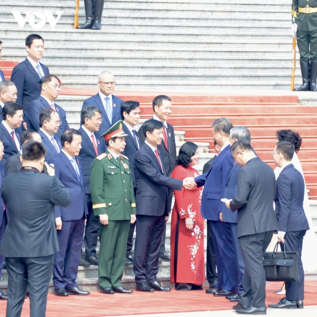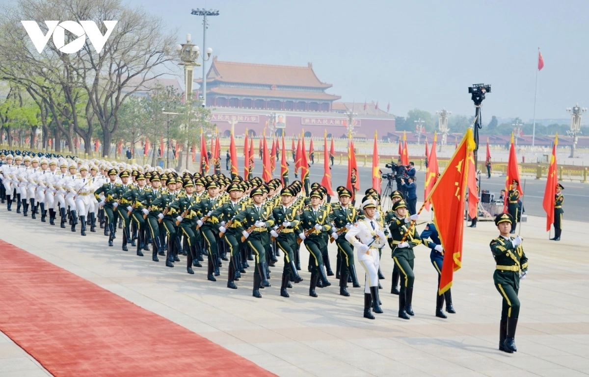 Sau khi bước lên bục danh dự, Tổng Bí thư, Chủ tịch Trung Quốc Tập Cận Bình và Tổng Bí thư, Chủ tịch nước Tô Lâm duyệt đội danh dự Quân giải phóng Nhân dân Trung Quốc. Đông đảo các cháu thiếu nhi Trung Quốc trong những bộ trang phục rực rỡ, nồng nhiệt vẫy cờ, hoa chào mừng Tổng Bí thư, Chủ tịch nước Tô Lâm cùng Phu nhân và Đoàn đại biểu cấp cao nước ta.