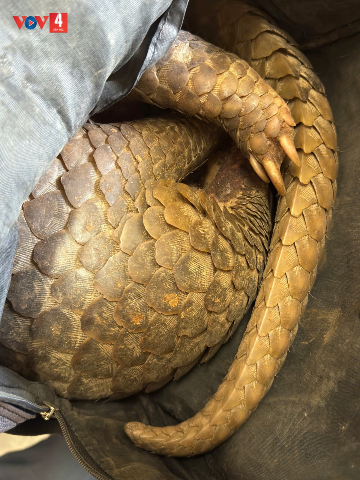 Tiến hành kiểm tra, lực lượng chức năng phát hiện phía trước xe mô tô có một ba lô màu xám, bên trong chứa 01 động vật hoang dã còn sống, có bốn chi, toàn thân phủ vảy, nghi là tê tê.