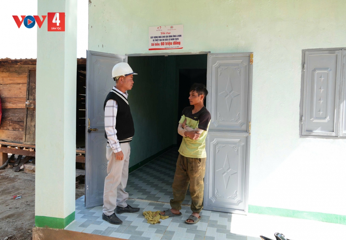 Từng viên gạch được đặt xuống, từng tấm tôn được dựng lên như vá lại những “vết nứt” của bản làng. Bàn tay của cán bộ, chiến sĩ cùng chính quyền địa phương và bà con trong thôn đều chung nhịp khẩn trương. Căn nhà dần hiện hình, mái tôn xanh nổi bật giữa màu xanh đại ngàn.