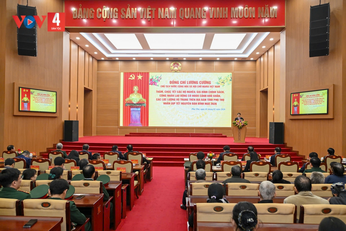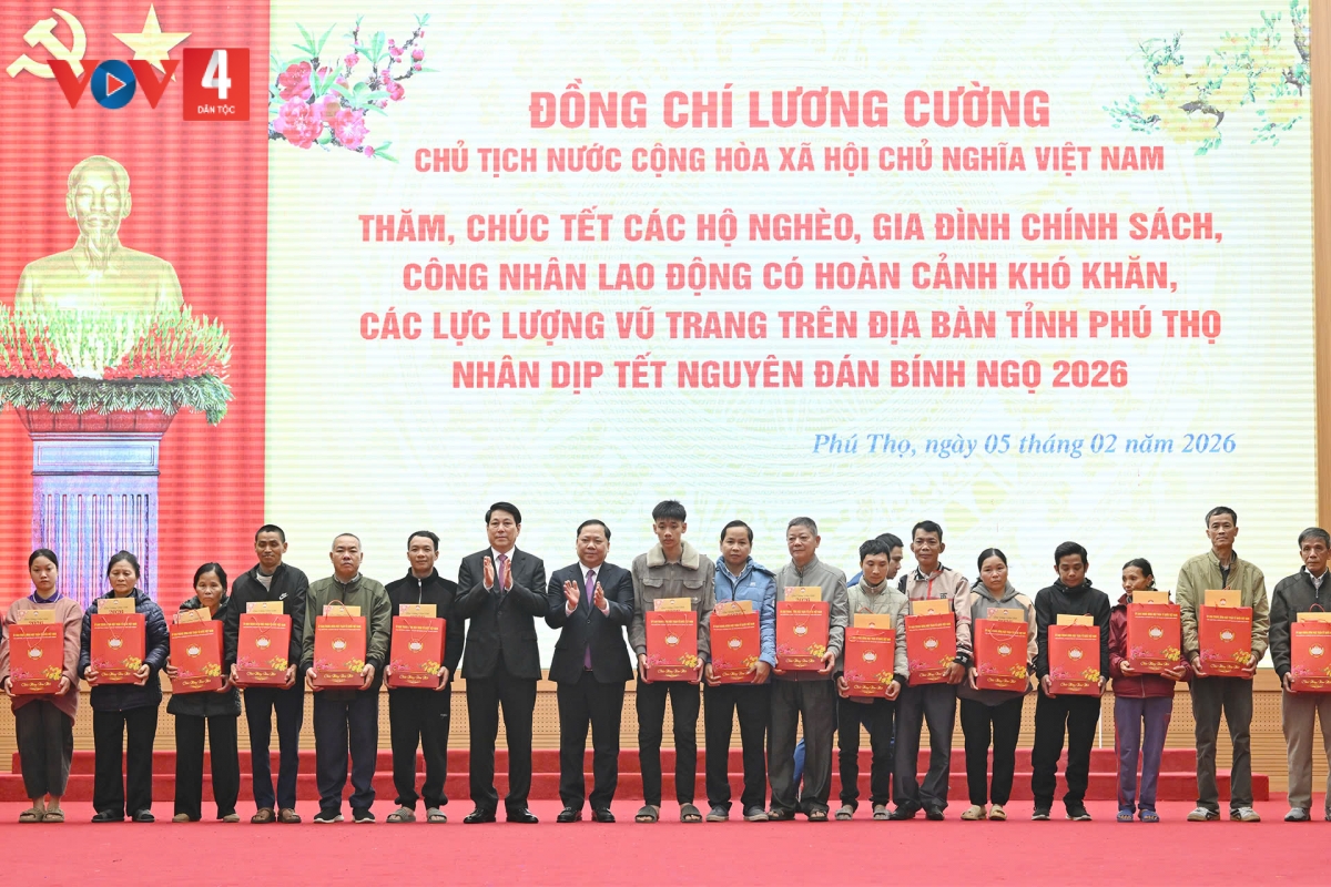 Nhân dịp Tết Bính Ngọ 2026, sáng 5/2, Chủ tịch nước Lương Cường và đoàn công tác Trung ương đã tới thăm, động viên và chúc Tết Đảng bộ, chính quyền, nhân dân, các hộ nghèo, gia đình chính sách, công nhân lao động có hoàn cảnh khó khăn và lực lượng vũ trang tỉnh Phú Thọ