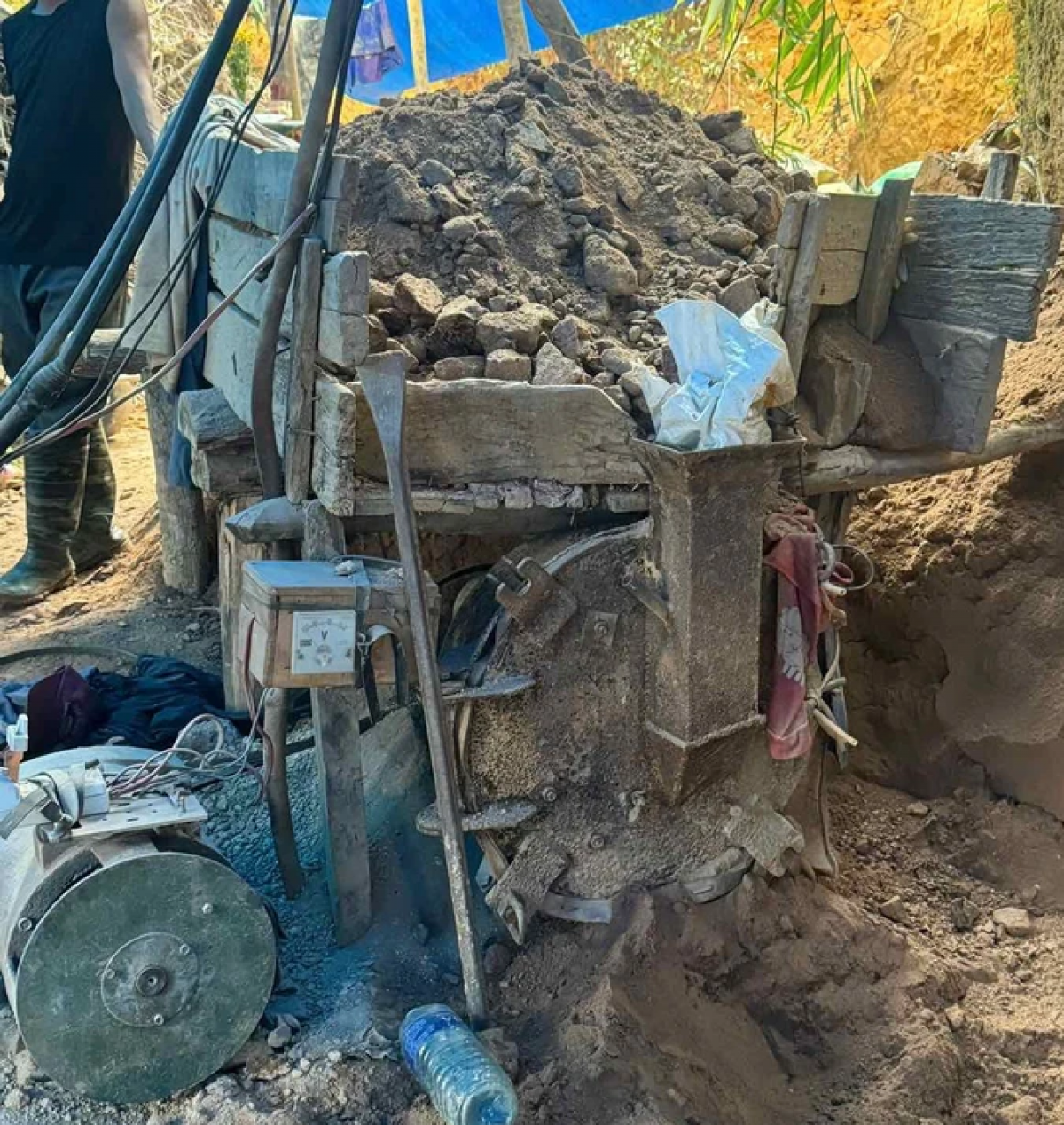Tại hiện trường, công an thu giữ nhiều máy móc, công cụ để hoạt động khai thác vàng, gồm 1 máy nổ, 1 máy tời, 1 máy nghiền, 3 xẻng, 1 xe rùa và khoảng 10 kg đất nghi có chứa quặng vàng.