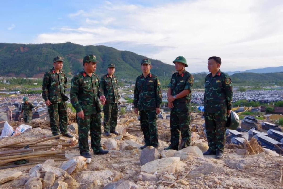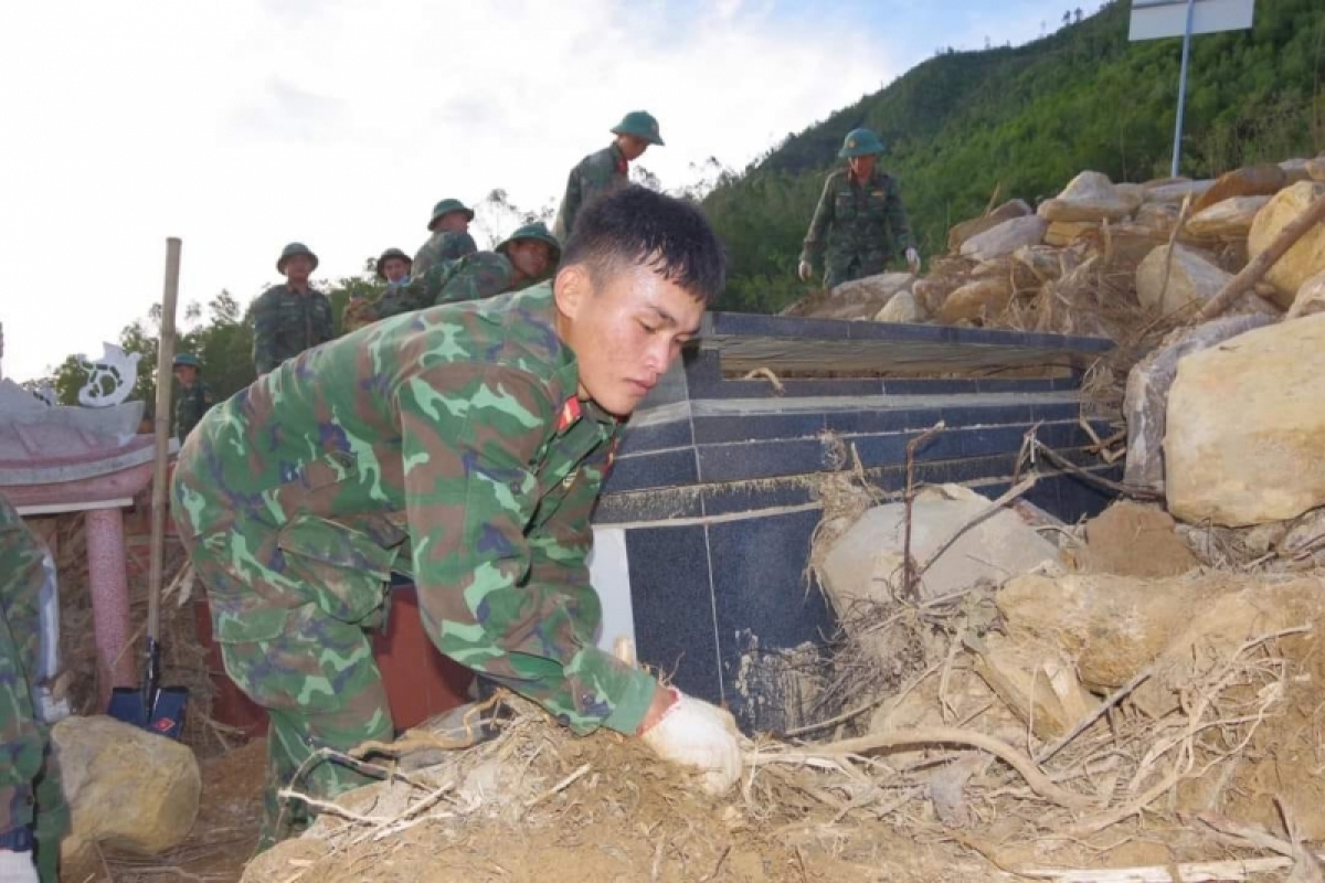 Hàng trăm cán bộ, chiến sĩ thuộc các đơn vị của Quân khu V và Bộ Chỉ huy Quân sự thành phố Đà Nẵng đã tham gia dọn dẹp đất đá, khắc phục sạt lở tại Nghĩa trang Hòa Sơn, giúp người dân tìm kiếm mồ mả người thân bị vùi lấp.