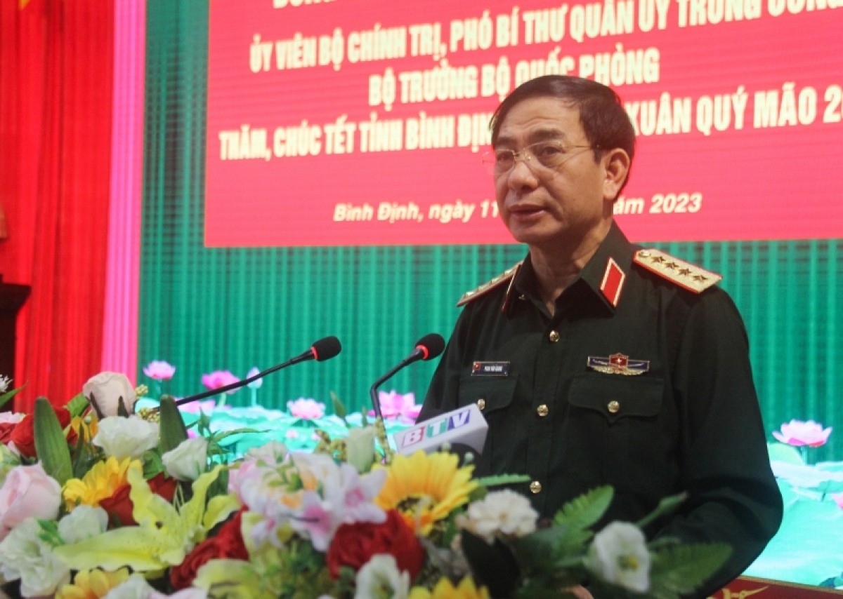 Chúc Tết Đảng bộ, chính quyền, nhân dân và các lực lượng vũ trang tỉnh Bình Định, Đại tướng Phan Văn Giang khái quát lại một số sự kiện chính trị nổi bật trong nước, thế giới trong năm 2022. Đồng thời gửi lời cảm ơn cấp ủy, chính quyền, nhân dân các dân tộc tỉnh Bình Định nhiều năm qua đã luôn cưu mang, che chở, hết lòng giúp đỡ các đơn vị lực lượng vũ trang đứng chân trên địa bàn hoàn thành tốt nhiệm vụ. Đại tướng Phan Văn Giang khẳng định, thực hiện chức năng đội quân chiến đấu, đội quân công tác và đội quân lao động sản xuất, trong bất cứ hoàn cảnh nào, quân đội luôn là đội quân xung kích đi đầu trong giúp đỡ, hỗ trợ nhân dân phát triển kinh tế, xóa đói giảm nghèo; phòng, chống thiên tai, bão lũ; tích cực cùng nhân dân xây dựng nông thôn mới.
