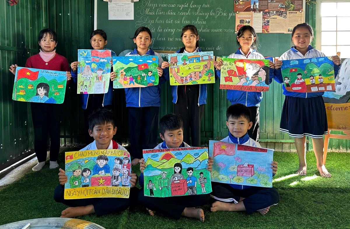 Hưởng ứng lời kêu gọi, các em học sinh đã vẽ nhiều bức tranh thể hiện niềm vui, niềm tự hào của đồng bào Xơ Đăng hướng về ngày hội đi bầu cử.