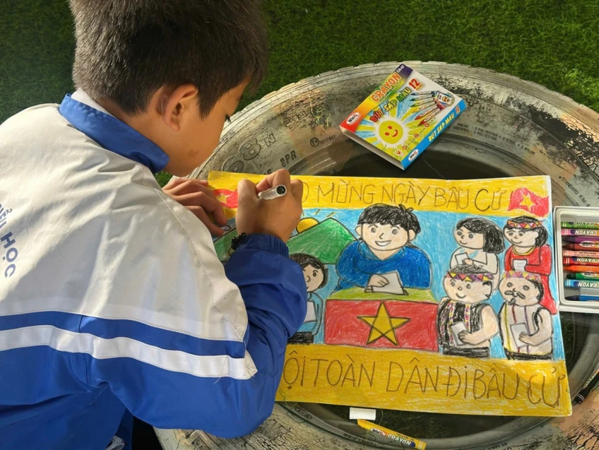 Học sinh Xơ Đăng vẽ tranh chào mừng ngày bầu cử