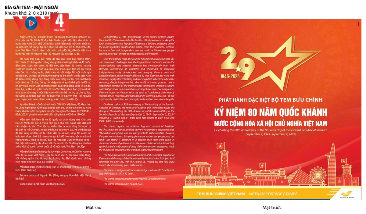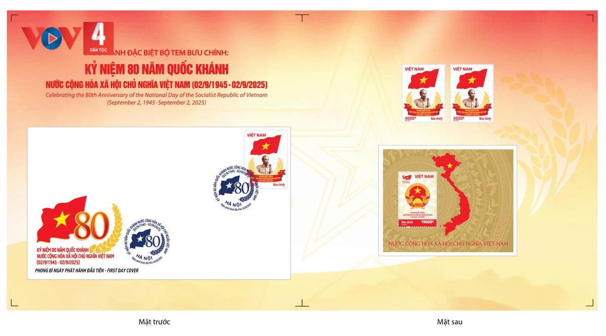 Bộ ấn phẩm đặc biệt mang tên “Dấu son lịch sử” bao gồm: Tờ tem “Ngày hội non sông”; Bìa gài tem A5 Quốc khánh; Bìa gài phát hành đặc biệt Bộ tem bưu chính “Kỷ niệm 80 năm Quốc khánh nước Cộng hòa Xã hội Chủ nghĩa Việt Nam” và Sổ tem lưu niệm. Trong đó, tờ tem “Ngày hội non sông”: Tái hiện trọn vẹn giây phút lịch sử ngày 02/9/1945 tại Quảng trường Ba Đình, khi Chủ tịch Hồ Chí Minh đọc Tuyên ngôn Độc lập, khai sinh nước Việt Nam Dân chủ Cộng hòa. Trên nền màu cờ đỏ rực rỡ, hình ảnh Quốc huy, bản đồ Việt Nam và những mốc son tiêu biểu trong 80 năm qua trở thành điểm nhấn đầy tự hào của dân tộc. Bìa gài phát hành đặc biệt Bộ tem bưu chính “Kỷ niệm 80 năm Quốc khánh nước Cộng hòa Xã hội Chủ nghĩa Việt Nam” với hình ảnh Bác Hồ đọc Tuyên ngôn Độc lập, lá cờ đỏ sao vàng tung bay cùng những mảng màu biểu trưng cho hòa bình, phát triển và hội nhập. Với hình thức trình bày trang trọng, nội dung sâu sắc, đây là món quà đầy ý nghĩa dành cho những người yêu quý và trân trọng các giá trị lịch sử dân tộc Việt Nam.