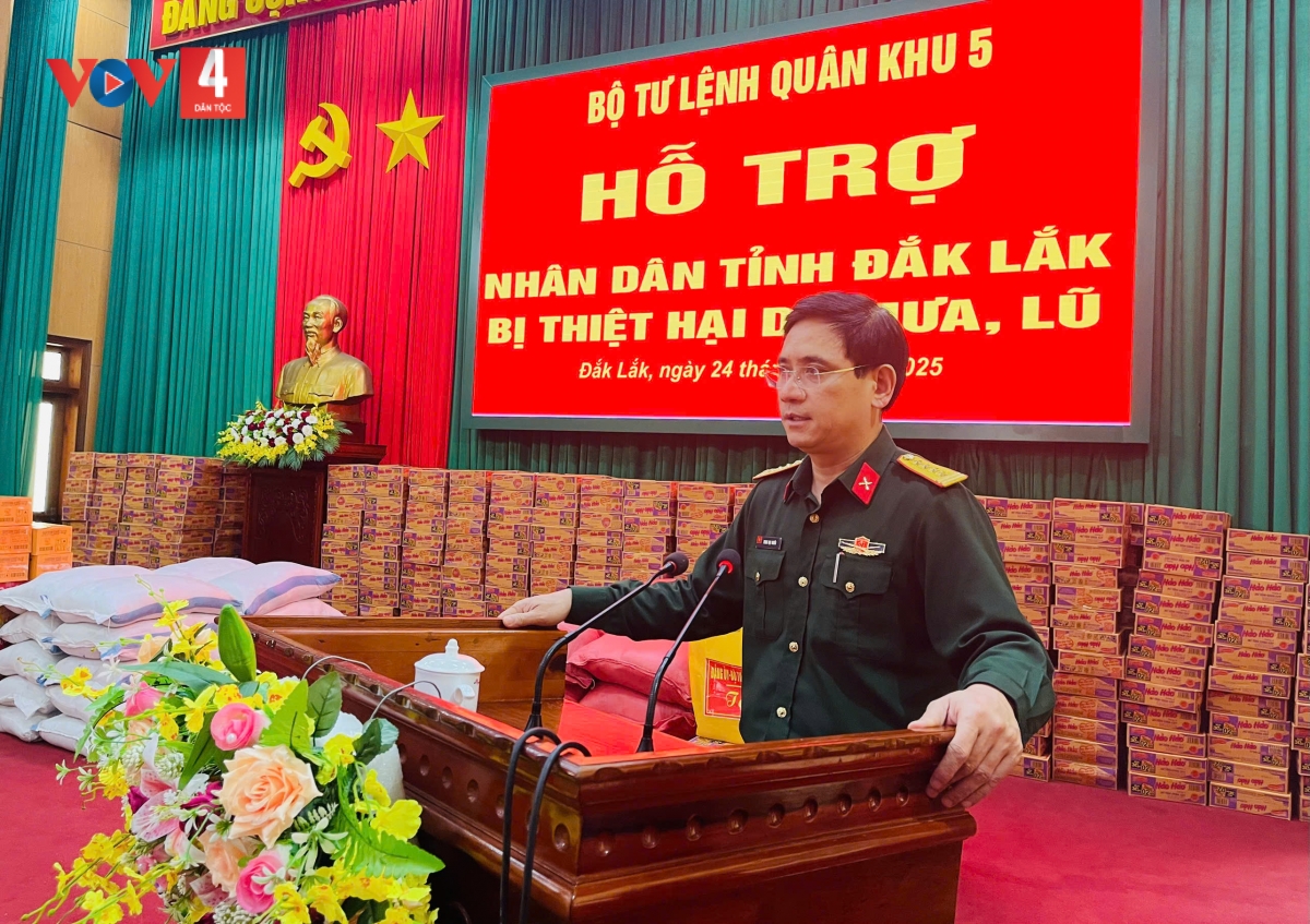Tiếp đó, Đoàn công tác Quân khu 5 đã đến thăm, động viên và trao 50 suất quà tặng bà con vùng rốn lũ xã Hòa Xuân. Bộ Tư lệnh Quân khu 5 cũng hỗ trợ Nhân dân tỉnh Đắk Lắk bị thiệt hại do mưa lũ 12.000 màn tuyn, 12.000 bộ quần áo dân sự, 20 tấn gạo, 14 tấn lương khô, 5 tấn thực phẩm và 2.200 suất quà, góp phần giúp người dân sớm vượt qua giai đoạn khó khăn sau lũ./.