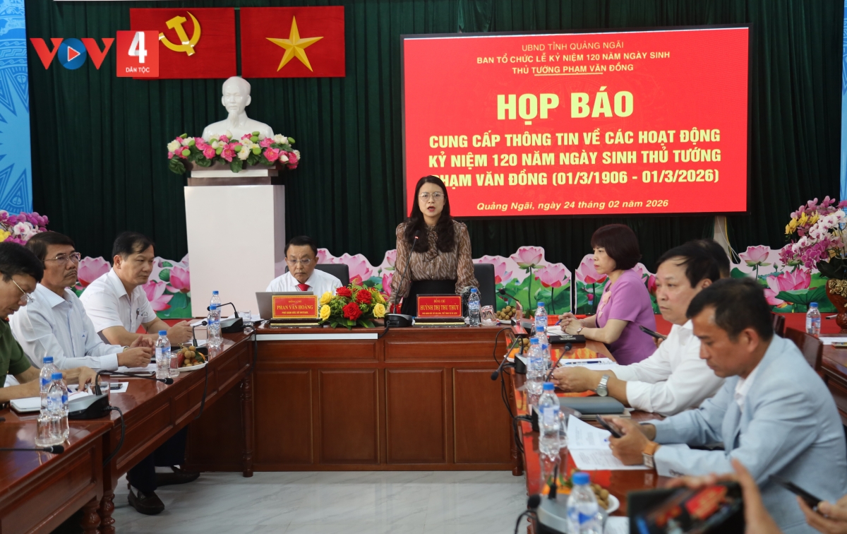 Chiều 24/2, tại tỉnh Quảng Ngãi, Ban Tổ chức Lễ kỷ niệm 120 năm Ngày sinh Thủ tướng Phạm Văn Đồng đã tổ chức họp báo, cung cấp thông tin đến các cơ quan thông tấn, báo chí về chuỗi hoạt động kỷ niệm 120 năm Ngày sinh Thủ tướng Phạm Văn Đồng (01/3/1906 – 01/3/2026)