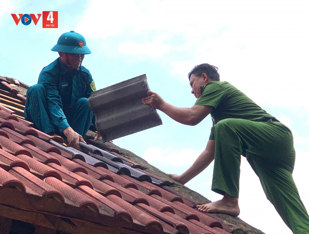 Hàng chục cán bộ, chiến sĩ công an, quân sự, lực lượng dân quân cùng đoàn viên, thanh niên địa phương đã được huy động đến các khu dân cư ở xã Ba Vì hỗ trợ người dân lợp lại mái nhà bị tốc, thu dọn cây xanh gãy đổ, gia cố các hạng mục hư hỏng, bảo đảm an toàn cho người dân.