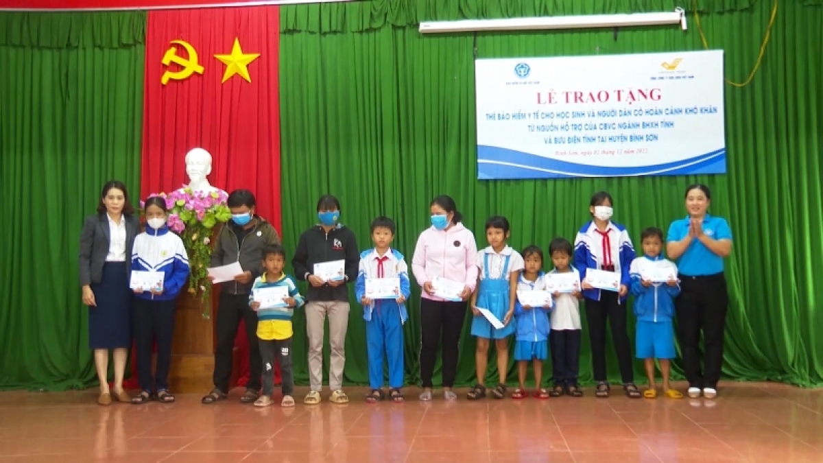 Những hộ làm nông nghiệp, lâm nghiệp có thu nhập trung bình ở các xã miền núi đạt chuẩn nông thôn mới cũng không còn được hỗ trợ 100% thẻ Bảo hiểm y tế như trước, mà chỉ được ngân sách trung ương hỗ trợ 30% và 20% còn lại ngân sách địa phương hỗ trợ. Ông Hà Hoài Nam, Phó Giám đốc Ngân hàng Nông nghiệp và Phát triển Nông thôn, Chi nhánh Quảng Ngãi cho biết, nhằm giảm bớt khó khăn cho bà con vùng cao, tập thể cán bộ, nhân viên, người lao động của đơn vị vừa đóng góp hơn 50 triệu đồng mua hơn 90 thẻ Bảo hiểm y tế tặng học sinh dân tộc thiểu số hoàn cảnh khó khăn tại Trường Trung học cơ sở Long Sơn, huyện Minh Long, tỉnh Quảng Ngãi: “Tôi mong muốn trong thời gian tới, Bảo hiểm Xã hội tỉnh Quảng Ngãi, cũng như Agribank xem đây là việc làm thường niên. Qua đó, tạo điều kiện cho các em học sinh nghèo, có hoàn cảnh khó khăn, tiếp cận với các dịch vụ y tế.”