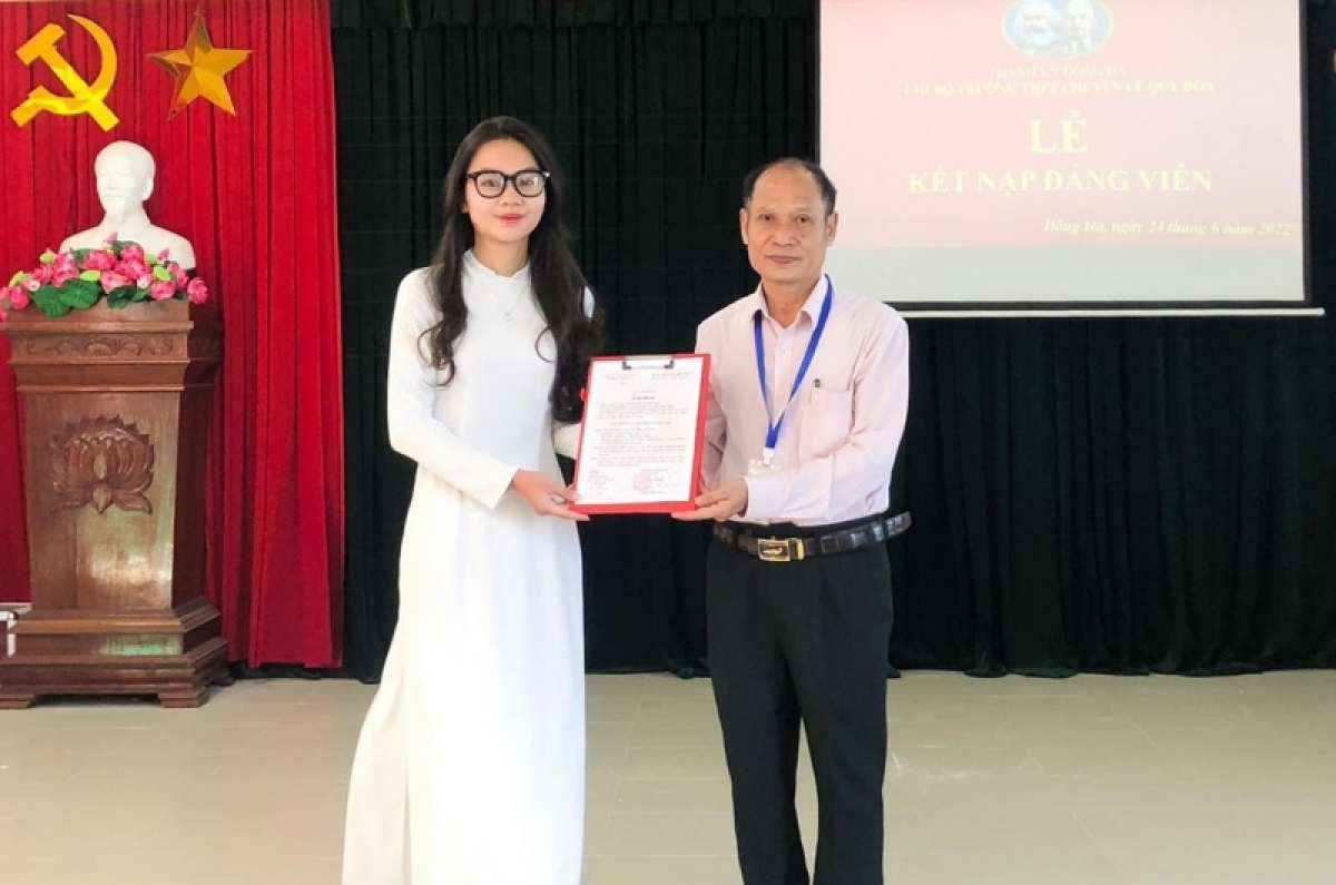 Những ngày tháng 6 vừa qua là kỷ niệm đáng nhớ trong đời học sinh đối với Văn Thái Ngọc Hân, học sinh lớp 12 chuyên Tin, Trường Trung học phổ thông chuyên Lê Quý Đôn, tỉnh Quảng Trị khóa học 2021-2022. Ngọc Hân là học sinh duy nhất của trường trong năm học vừa qua được đứng vào hàng ngũ của Đảng khi tròn 18 tuổi.