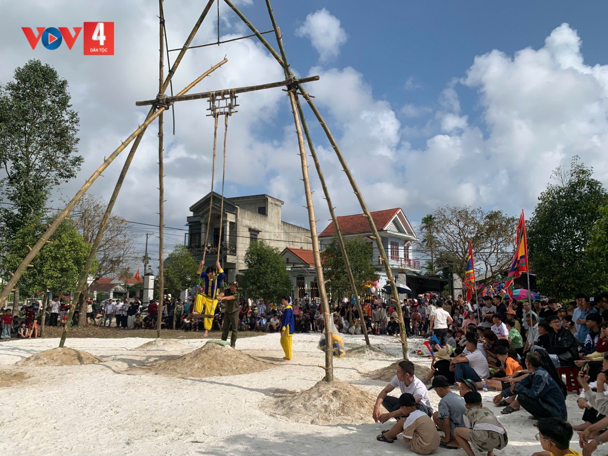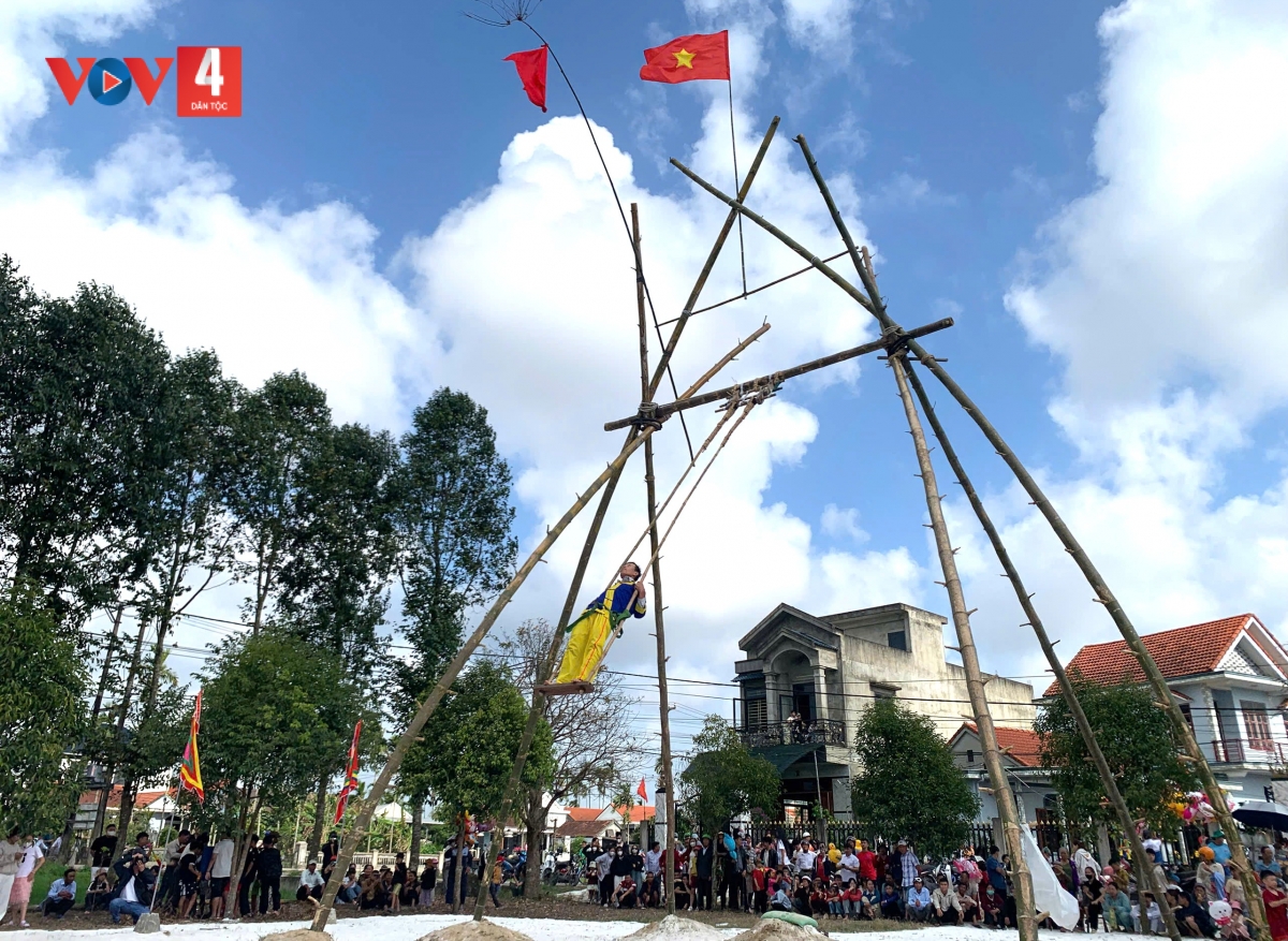 Mở đầu hội là nghi thức khai hội trang trọng do một bô lão uy tín thực hiện. Trong tà áo dài, khăn đóng chỉnh tề, vị cao niên thực hiện những nhịp đu đầu tiên – từng chuyển động nhịp nhàng như lời chúc cho một năm mới bình an, thuận lợi. Sau nghi lễ, sân làng thực sự bùng nổ với những màn tranh tài sôi nổi của các nam thanh niên. Mỗi nhịp đu vút cao là một lần người xem nín thở, rồi lại vỡ òa trong tiếng reo hò cổ vũ.