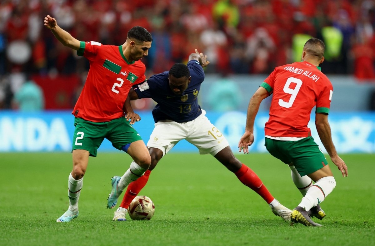 Ma rốc chỉ thực sự đáp trả ở cuối hiệp 1, với pha ngả người dứt điểm ngẫu hứng đưa bóng đi dội cột của Yamiq. Đội bóng của HLV Regragui thiếu kinh nghiệm và cả may mắn để tìm thấy mành lưới Pháp ở nửa đầu trận đấu.