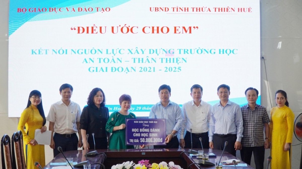 Dịp này, Thứ trưởng Ngô Thị Minh và Đoàn công tác của Bộ làm việc với lãnh đạo UBND tỉnh Thừa Thiên Huế cùng các đơn vị liên quan về Chương trình “Điều ước cho em” của Bộ giáo dục và Đào tạo. Dịp này, Đoàn công tác trao học bổng và một số quà như: đèn học thông minh, dụng cụ thể thao, bình lọc nước và các vật dụng tặng một số cơ sở giáo dục trên địa bàn tỉnh Thừa Thiên Huế./.