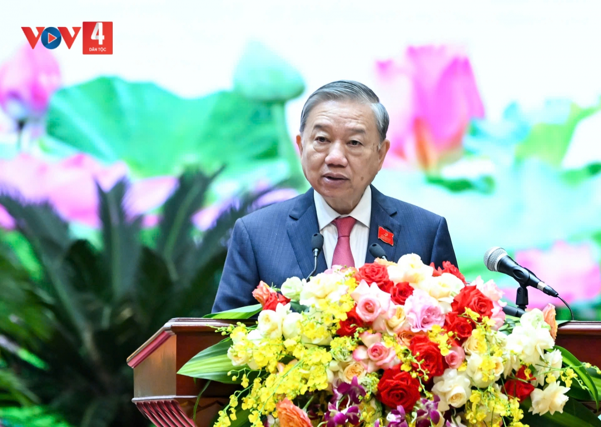 Tổng Bí thư Tô Lâm, Bí thư Quân uỷ Trung ương lâng Chủ tịch nước Lương Cường tươc pâh Đại hội.