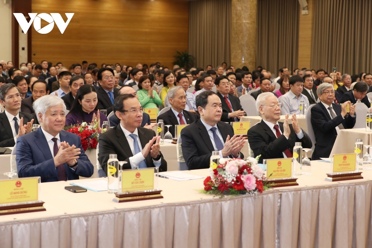 Phát biểu tại buổi lễ, Tổng Bí thư Nguyễn Phú Trọng khẳng định, trải qua quá trình lịch sử lâu dài của dân tộc, trí thức Việt Nam luôn luôn nêu cao tinh thần yêu nước, lòng tự hào dân tộc, và giữ vai trò quan trọng trong sự nghiệp dựng nước và giữ nước. Cũng chính vì vậy mà cha ông ta đã luôn luôn quý trọng hiền tài và đội ngũ trí thức. Khẳng định trong mọi thời đại, ở mọi quốc gia, đội ngũ trí thức luôn luôn là một lực lượng quan trọng thúc đẩy sự phát triển của xã hội, Tổng Bí thư Nguyễn Phú Trọng bày tỏ mong muốn thời gian tới, Liên hiệp các Hội Khoa học và Kỹ thuật Việt Nam, trí thức khoa học và công nghệ Việt Nam cần tiếp tục chủ động và làm tốt hơn nữa nhiệm vụ tham mưu cho Đảng và Nhà nước.