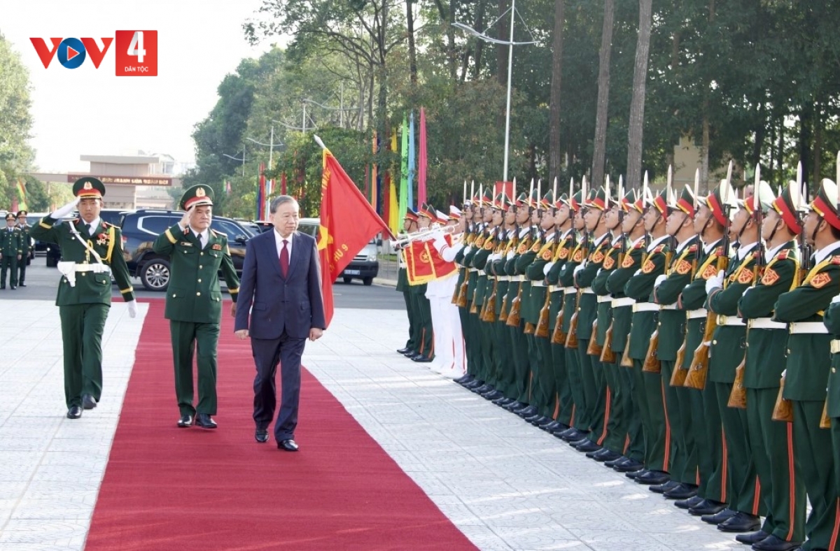 Tổng Bí thư đề nghị Quân khu tiếp tục quán triệt tư tưởng quân sự Hồ Chí Minh; thực hiện tốt đường lối quốc phòng của Đảng; nâng cao chất lượng tổng hợp, sức mạnh chiến đấu; giữ vững đoàn kết quân – dân; nắm chắc và dự báo đúng tình hình để tham mưu chiến lược cho Quân ủy Trung ương, Bộ Quốc phòng. Đồng thời củng cố nền quốc phòng toàn dân, thế trận quốc phòng gắn với an ninh Nhân dân; xây dựng khu vực phòng thủ vững chắc, chủ động làm thất bại mọi âm mưu chống phá, giữ vững môi trường hòa bình và chủ quyền đất nước. Trước lễ kỷ niệm, Tổng Bí thư Tô Lâm và đoàn công tác đã dâng hoa, dâng hương tại Nhà bia tưởng niệm các Anh hùng liệt sĩ, Tượng đài Chiến thắng và Nhà tưởng niệm Chủ tịch Hồ Chí Minh trong khuôn viên Quân khu 9./.