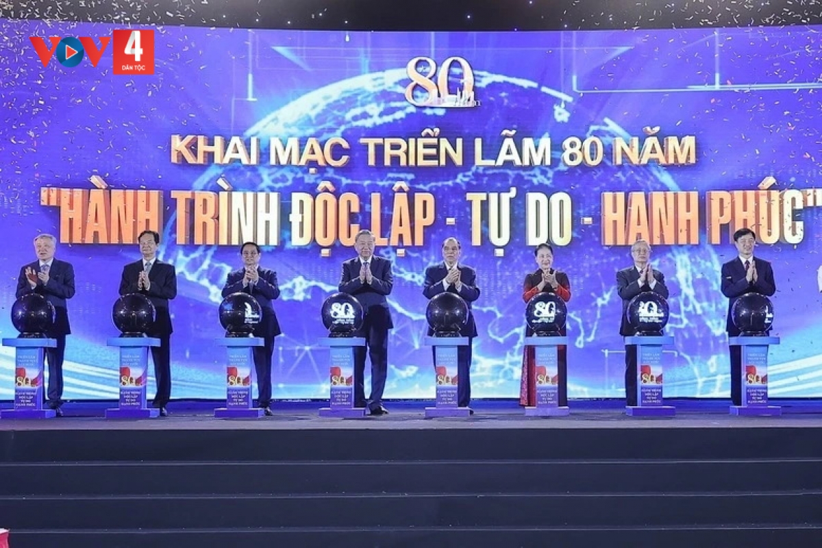 Tại buổi lễ, Tổng Bí thư Tô Lâm, Thủ tướng Chính phủ Phạm Minh Chính và các đồng chí lãnh đạo Đảng, Nhà nước đã thực hiện nghi thức bấm nút khai mạc Triển lãm "80 năm hành trình Độc lập - Tự do - Hạnh phúc" chào mừng kỷ niệm 80 năm Quốc khánh nước Cộng hòa Xã hội Chủ nghĩa Việt Nam.