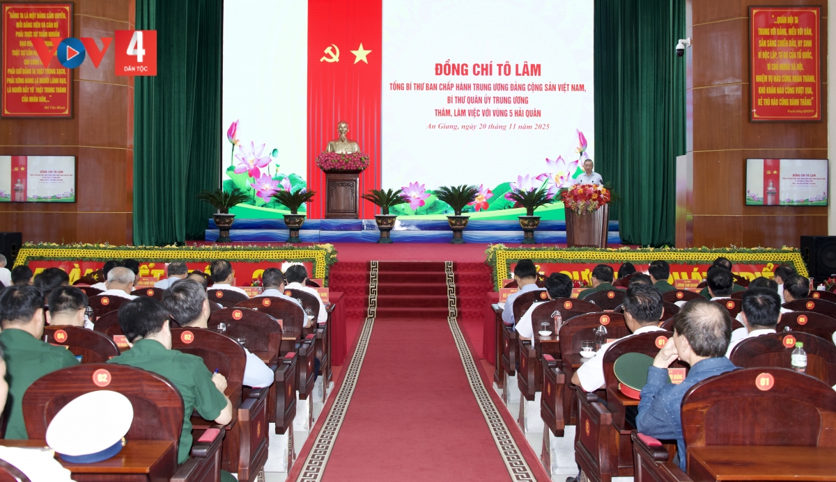 Sáng ngày 20/11, tại An Giang, Tổng Bí thư Tô Lâm, Bí thư Quân uỷ Trung ương tới thăm và chủ trì buổi làm việc với Bộ Tư lệnh Vùng cảnh sát biển 4 và cán bộ chiến sỹ Vùng 5 Hải quân.