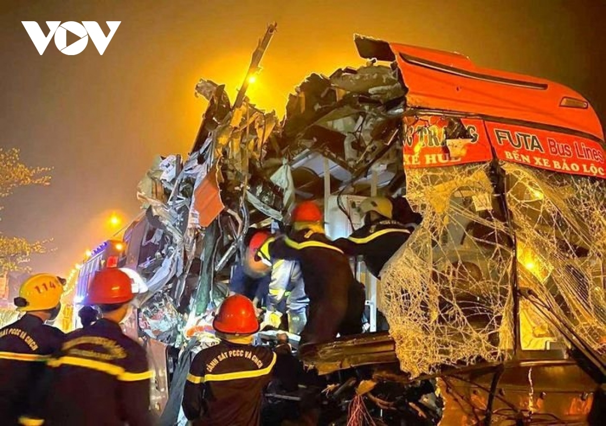 Cú tông mạnh nên đầu xe khách dính chặt vào đuôi xe tải bị biến dạng, 2 người trên xe khách chết tại chỗ, 1 người chết sau khi đưa đến bệnh viện cấp cứu, 17 người bị thương. Anh Nguyễn Bá Xuân (45 tuổi) ngụ thị xã Hương Trà, tỉnh Thừa Thiên Huế là một trong số 31 người đi trên xe khách gặp tai nạn sáng nay. Anh Xuân vừa rời quê vào lại tỉnh Lâm Đồng làm ăn sau Tết, nghe tin vợ ốm nặng nên nóng ruột bắt xe khách về nhà. Hơn 1 giờ sáng, mọi người trên xe khách đang say giấc thì cú va chạm khiến xe chao đảo. Anh Xuân nhớ lại cảnh tượng xảy ra tai nạn: “Công an đến cùng với người dân tiến hành tháo gỡ, đưa bệnh nhận mắc kẹt nặng ra khỏi xe trước, cỡ 5 phút là những trường hợp này được được ra trước. Cửa chính lúc đó đã bị bịt rồi chỉ còn cách thoát ra cửa sổ, người dân địa phương đã dùng thang để đưa chúng tôi leo ra, lần lượt thoát khỏi khỏi xe”.