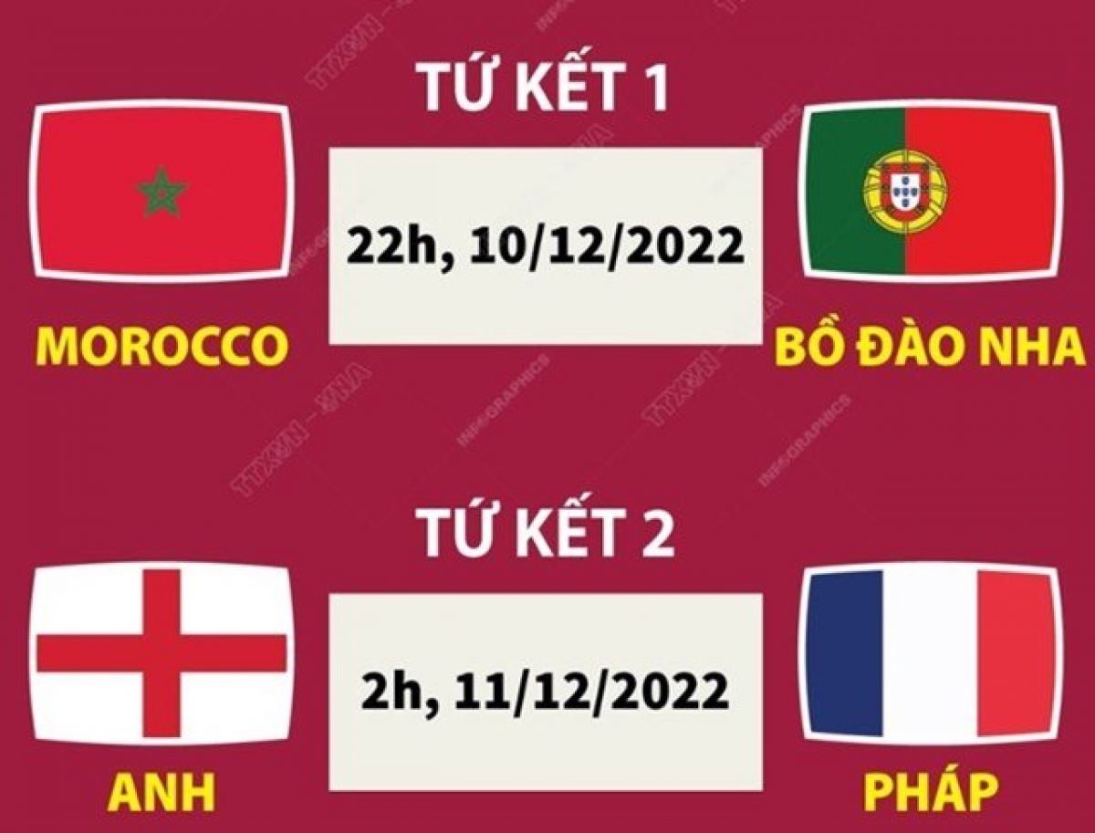 Ma rốc gặp Bồ Đào Nha (22h ngày 10/12) và Anh gặp Pháp (2h, ngày 11/12)./.