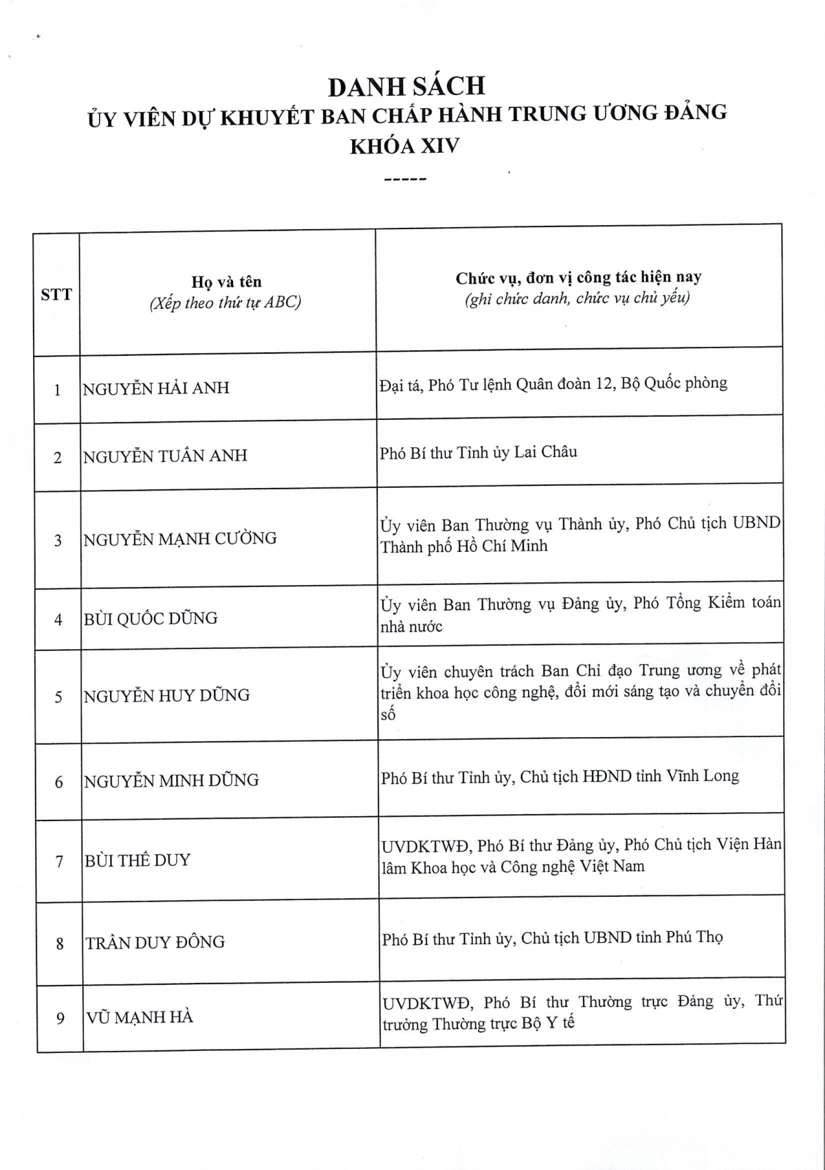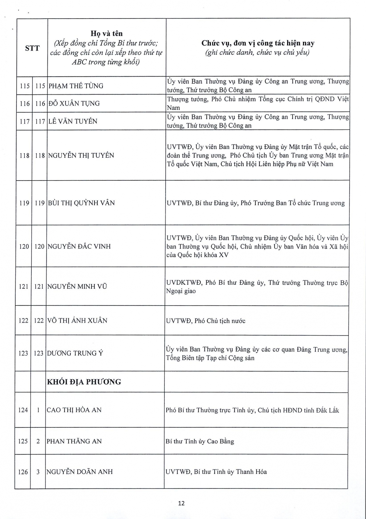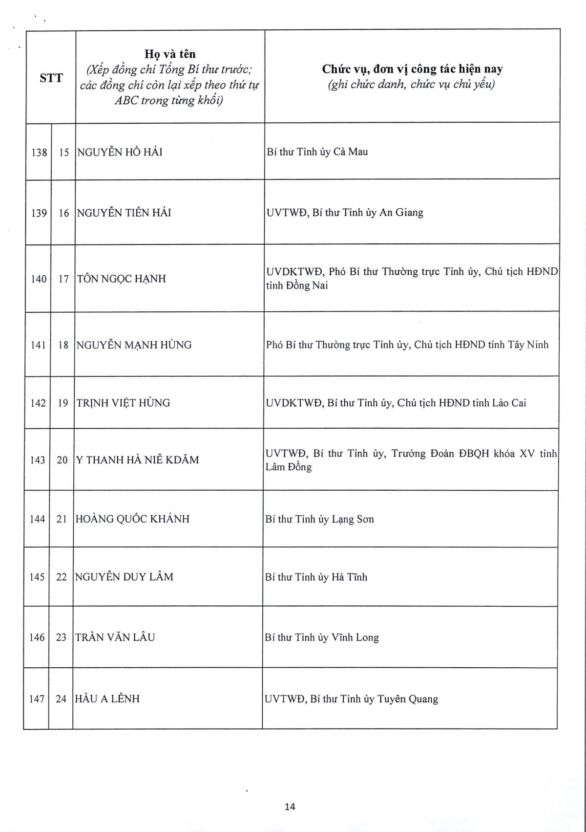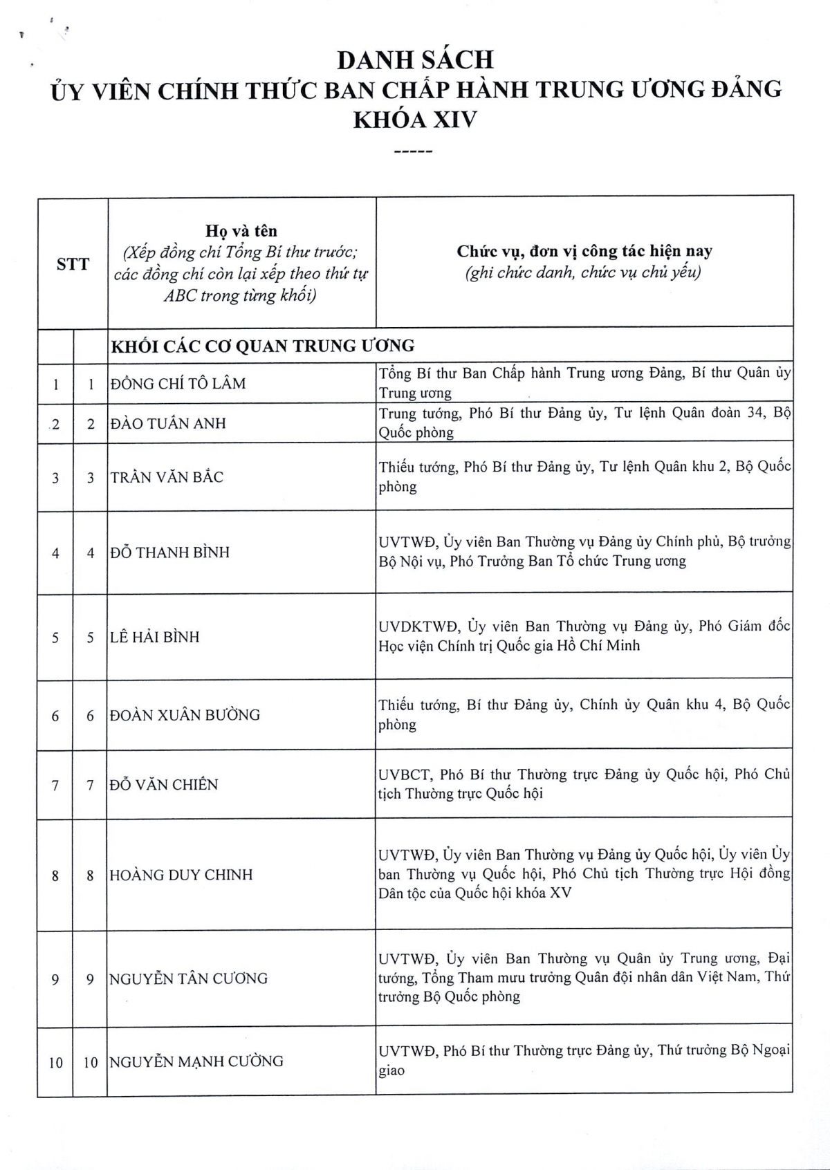 VOV.VN xin cập nhật danh sách Ban Chấp hành Trung ương khóa XIV, gồm 200 ủy viên, trong đó có 180 ủy viên chính thức và 20 ủy viên dự khuyết.