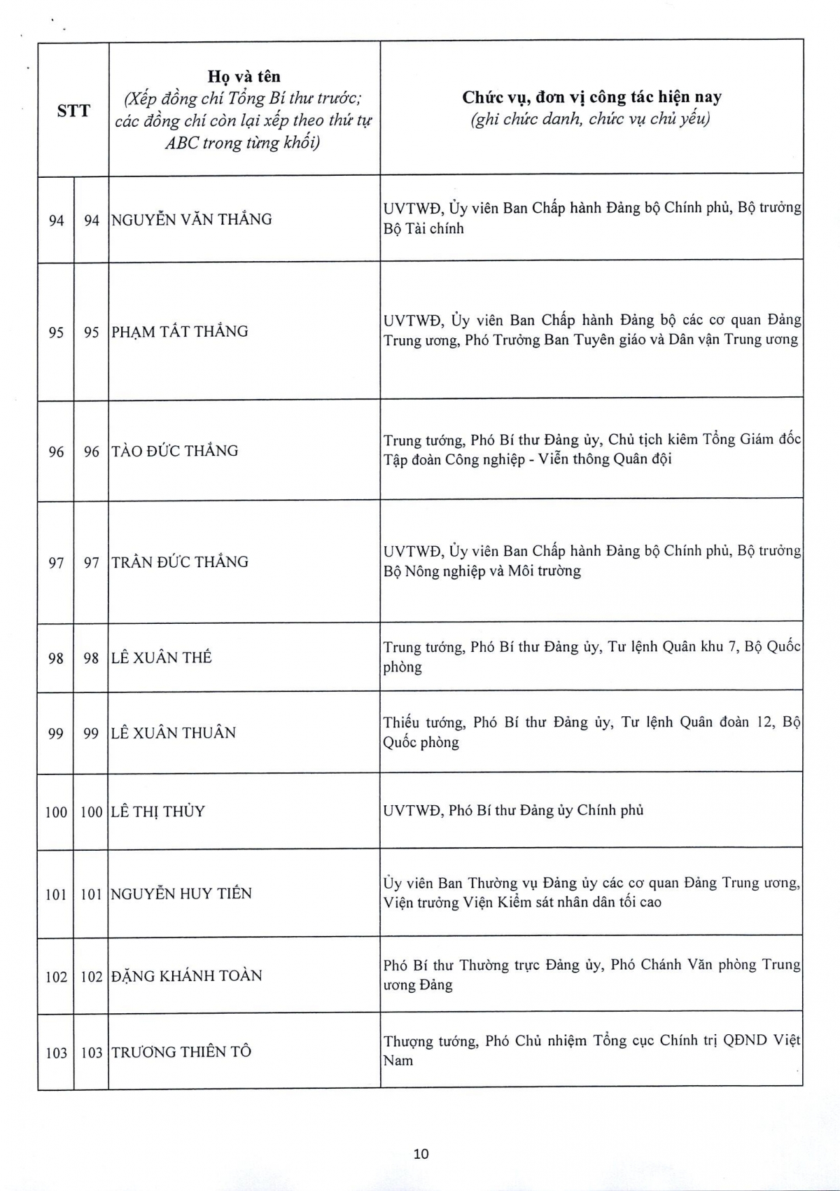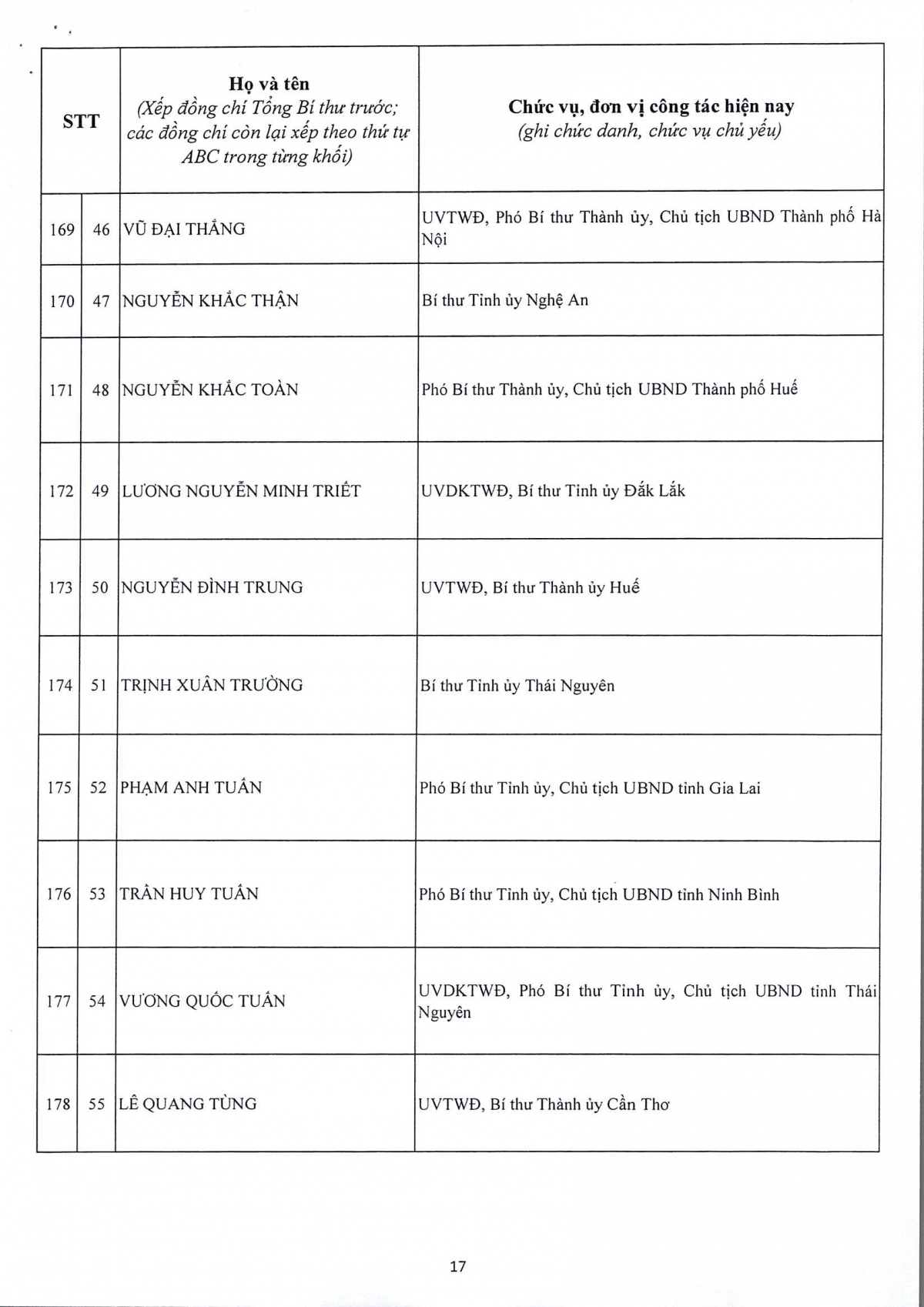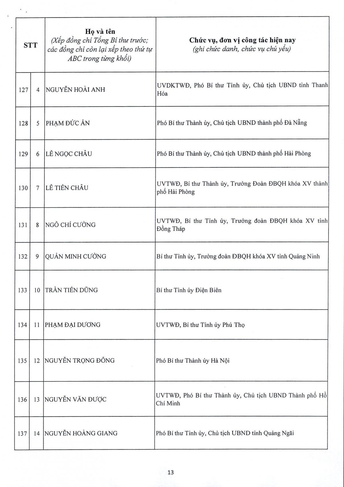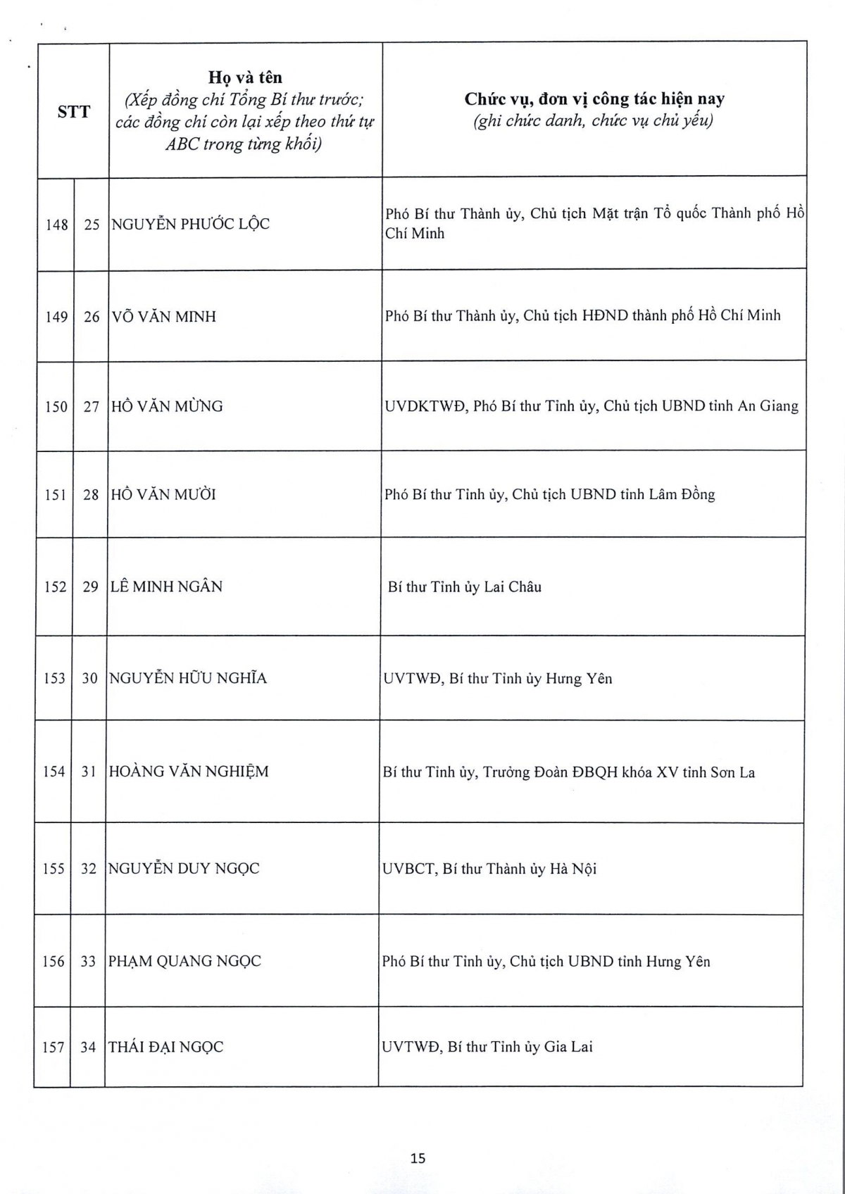 VOV.VN xin cập nhật danh sách Ban Chấp hành Trung ương khóa XIV, gồm 200 ủy viên, trong đó có 180 ủy viên chính thức và 20 ủy viên dự khuyết.