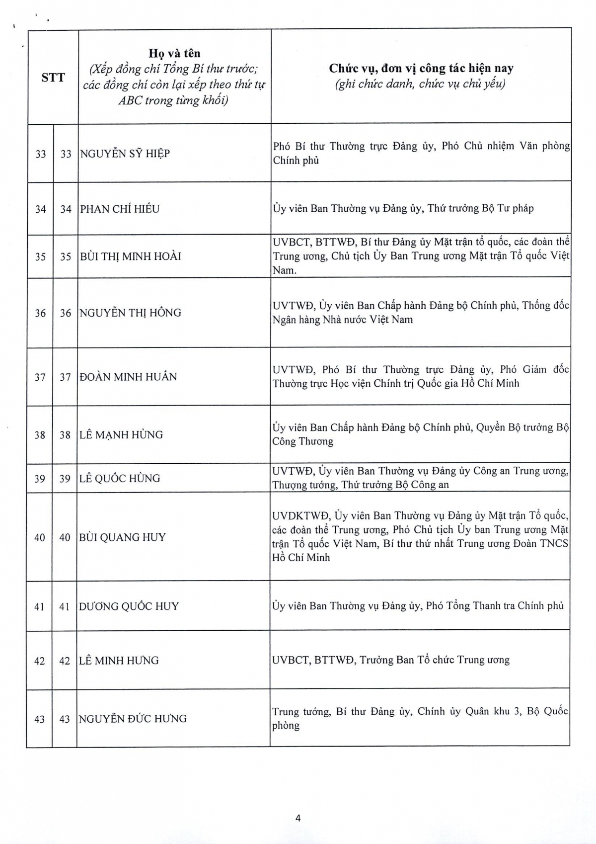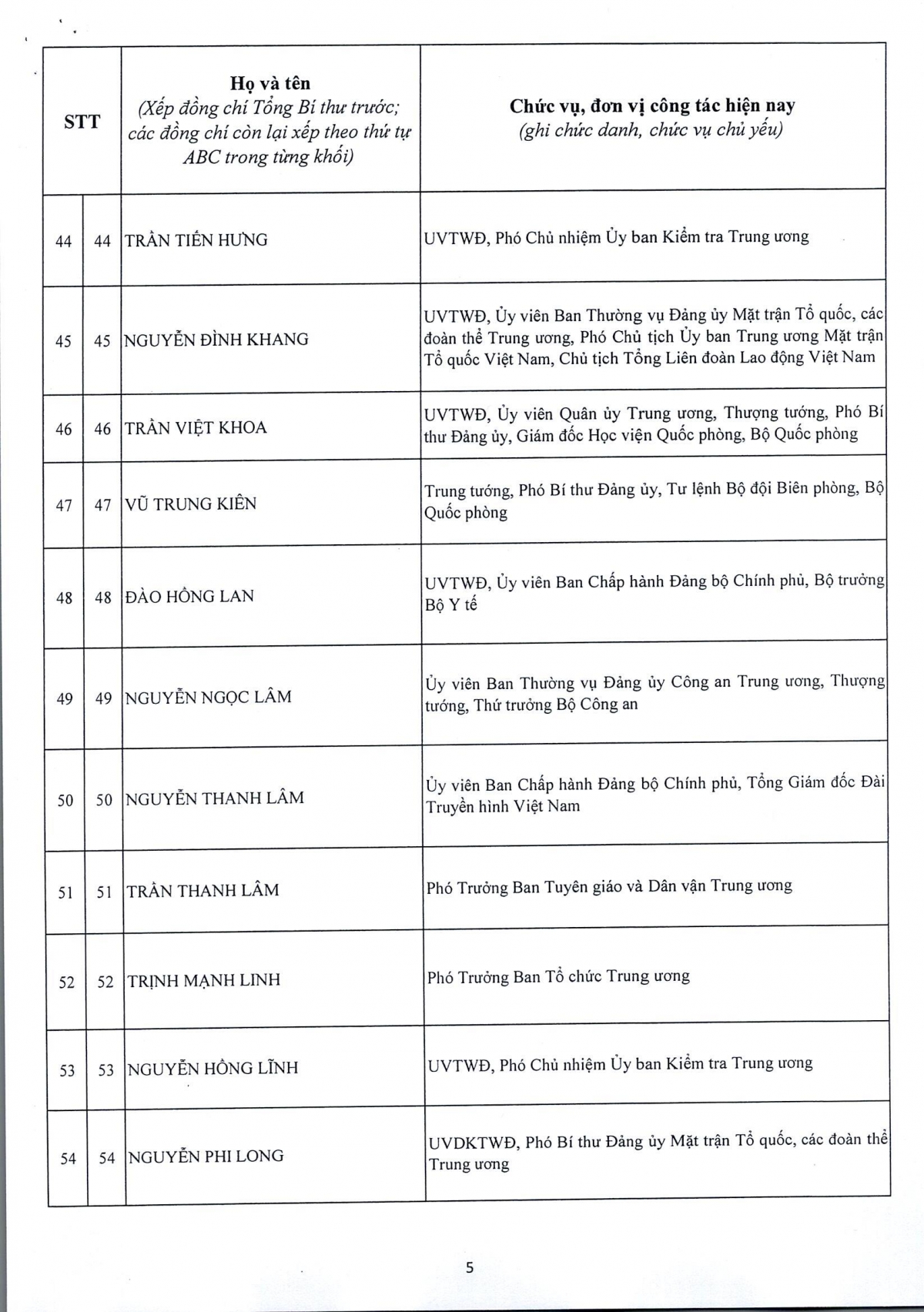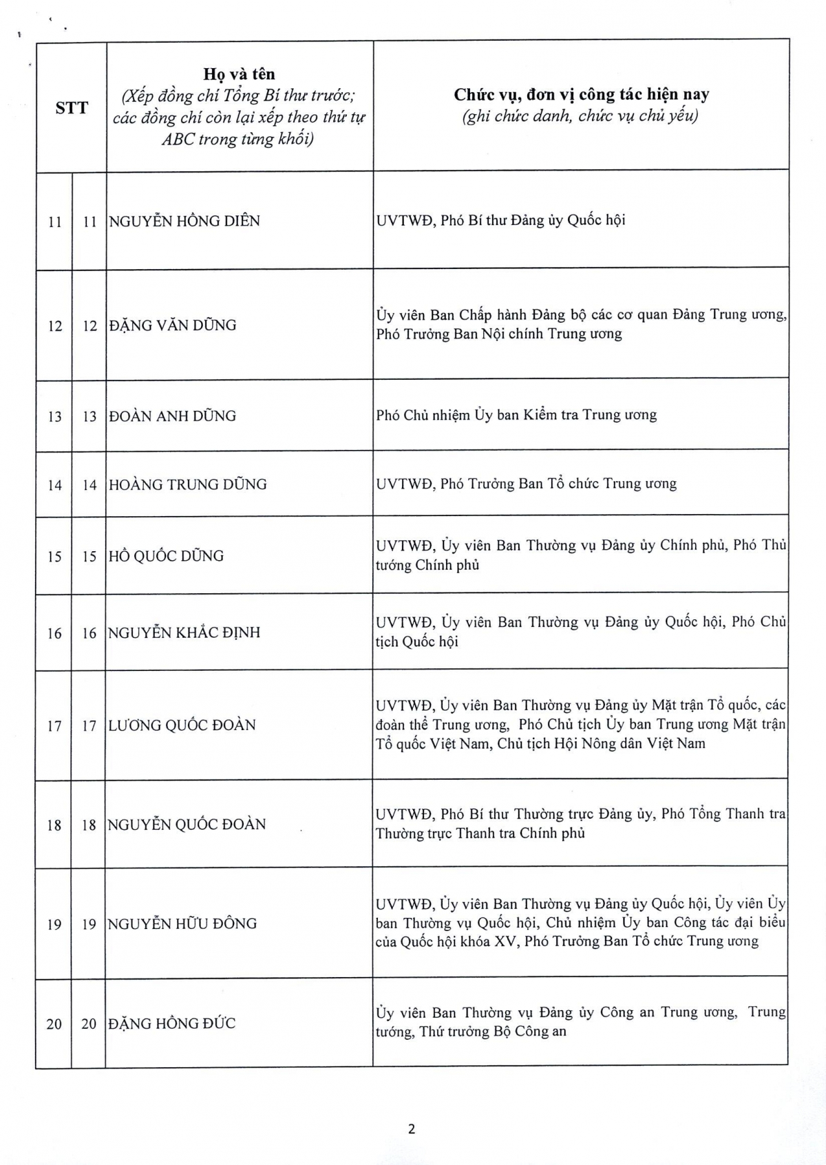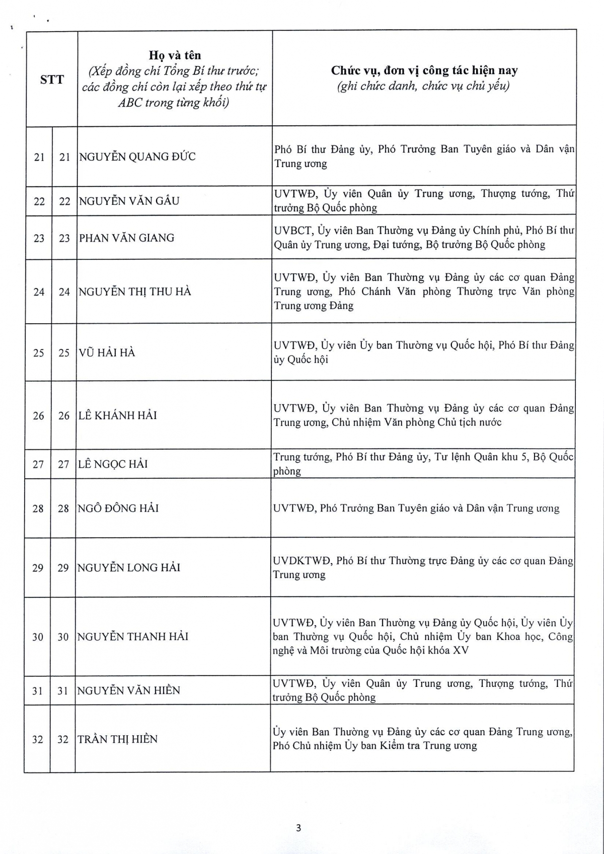 VOV.VN xin cập nhật danh sách Ban Chấp hành Trung ương khóa XIV, gồm 200 ủy viên, trong đó có 180 ủy viên chính thức và 20 ủy viên dự khuyết.