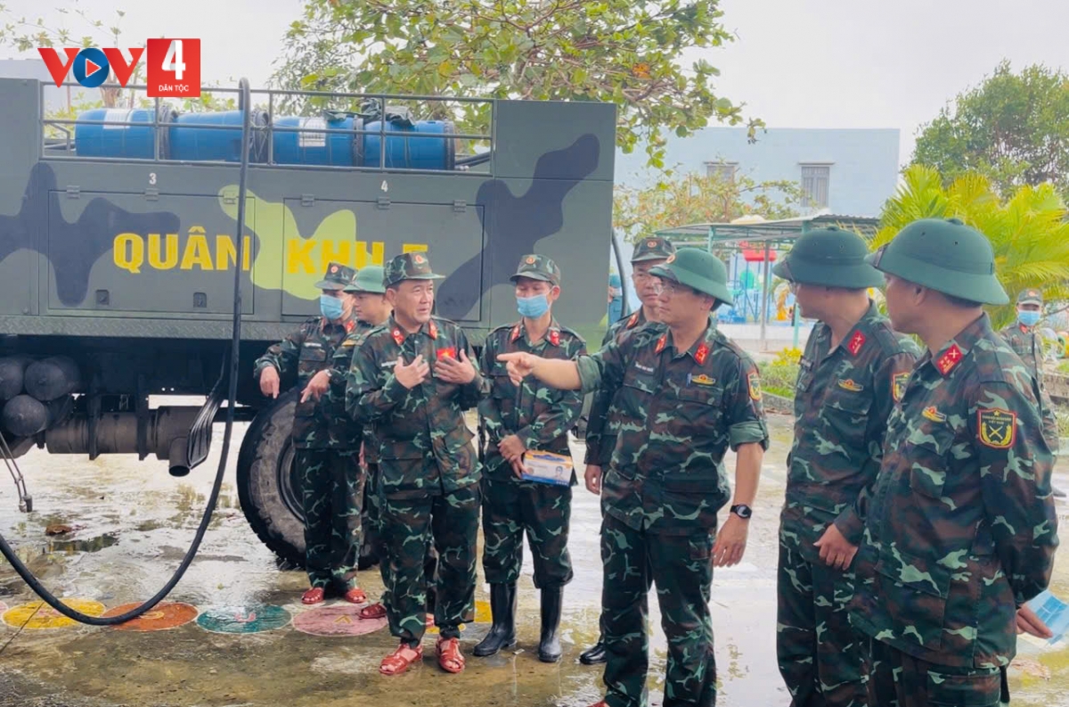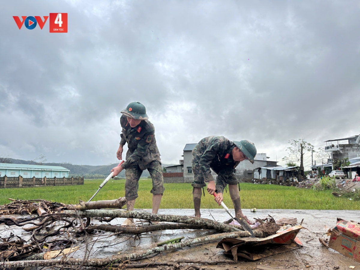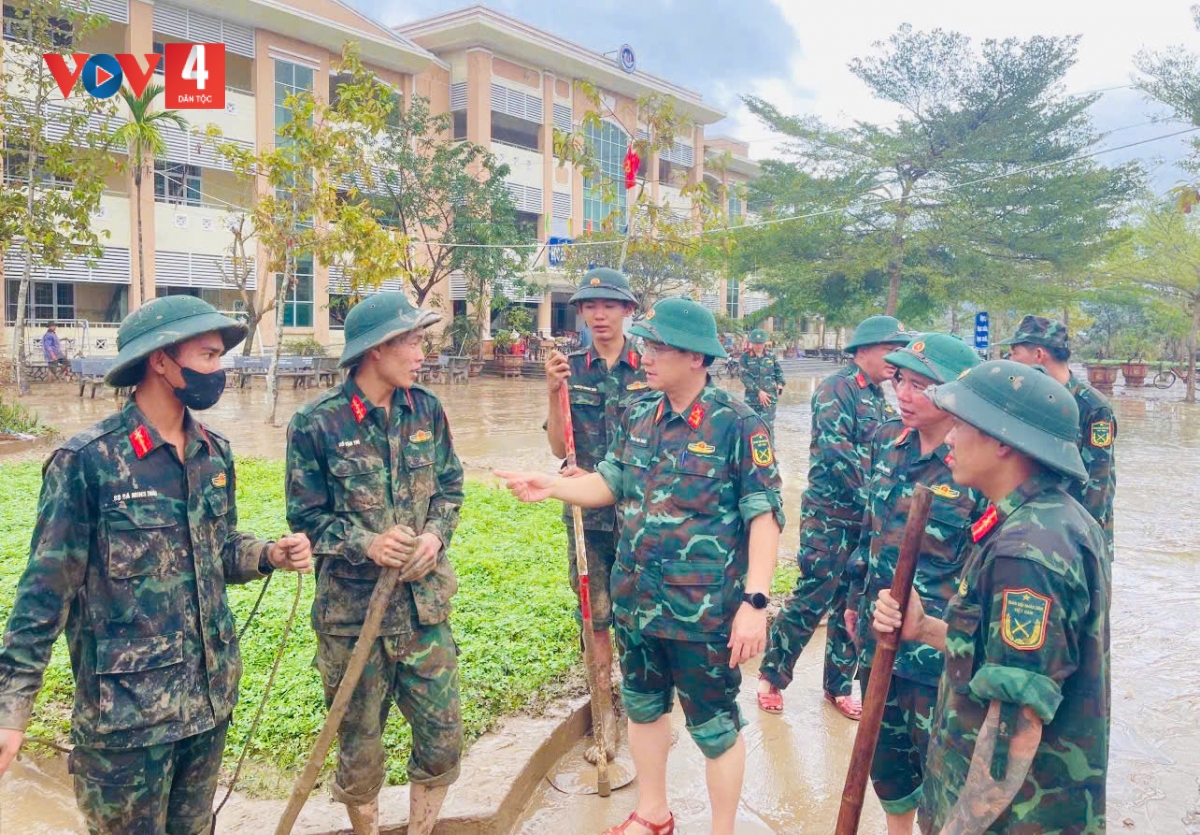 Khi lũ rút dần, lực lượng vũ trang Quân khu 5 đã hỗ trợ nhân dân khắc phục thiệt hại, thu dọn bùn non, rác thải hạn chế dịch bệnh sau mưa lũ.