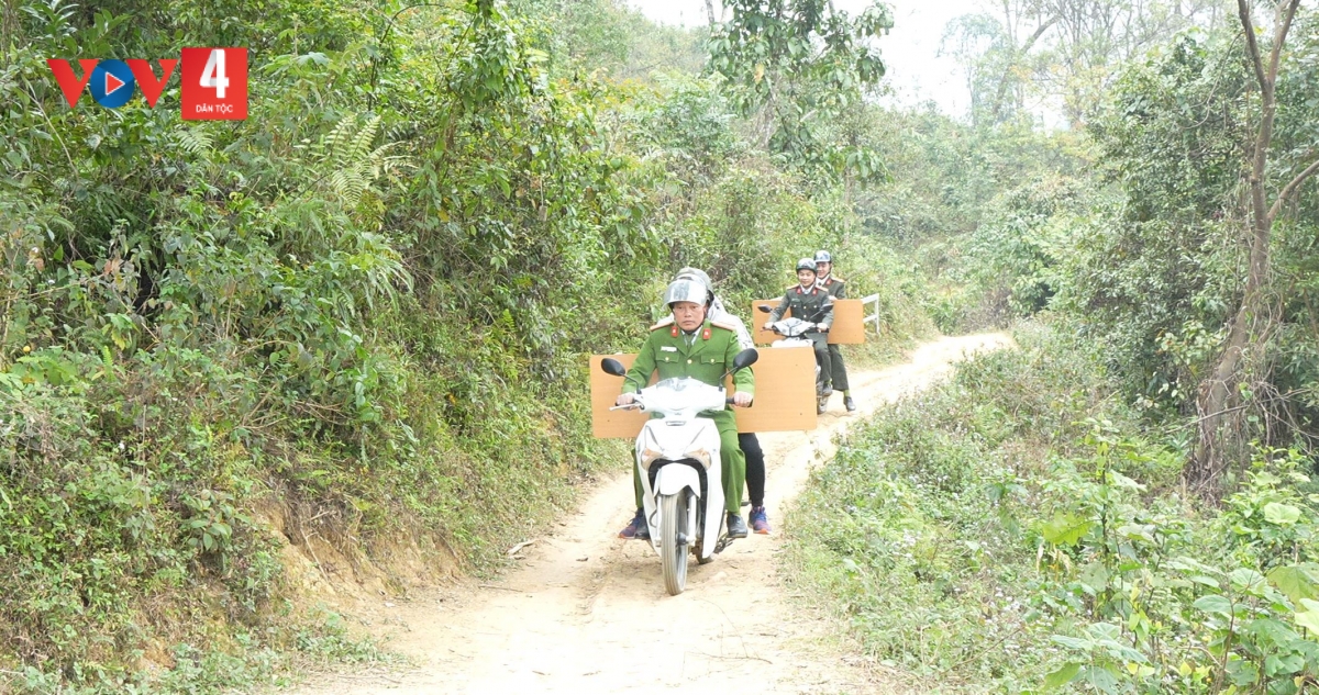 Trung úy Bế Trường Giang, cán bộ Công an hoẹn Quảng Hòa, slảnh Cao Bằng lẩn cạ, mọi vằn bại chài pây xe máy tềnh 3 cái hin tàng khau pù sle thâng lởp slon hẩư pỉ noọng, vằn tầư fạ phân lẻ bại chài lèo phjải kha.